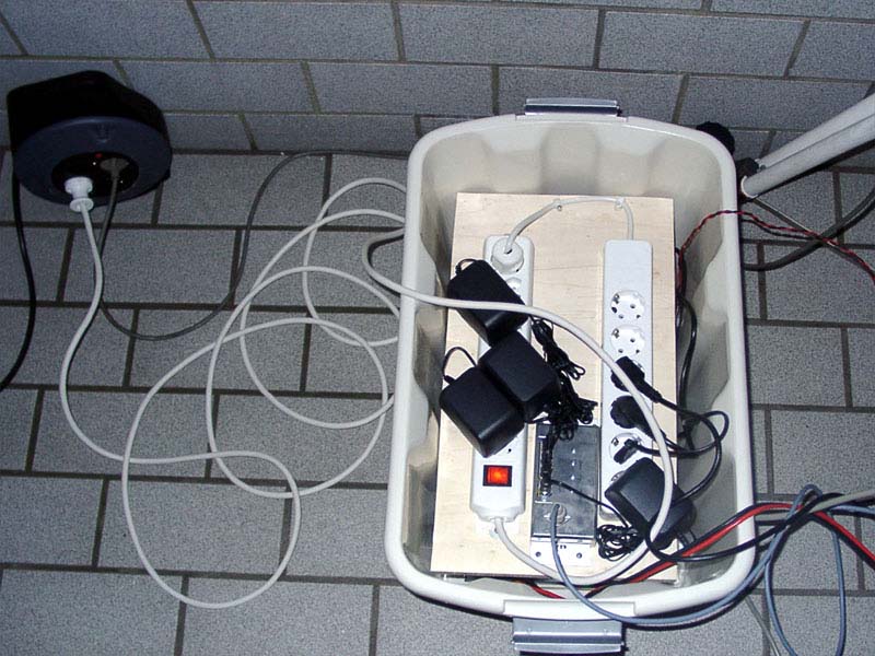 So sieht die Stromversorgungskiste von oben aus. Mit einem verschließbaren Decke ausgerüstet sind hier alle Kabel und Netzteile immer eingesteckt. |