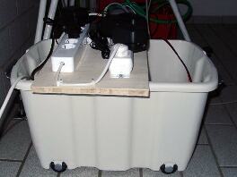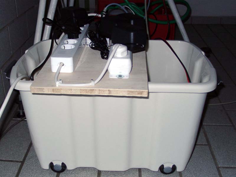 Wegen des schweren 30 A Netzteils habe ich eine rollbare Kiste ausgesucht, damit der Transport leichter fällt. |
