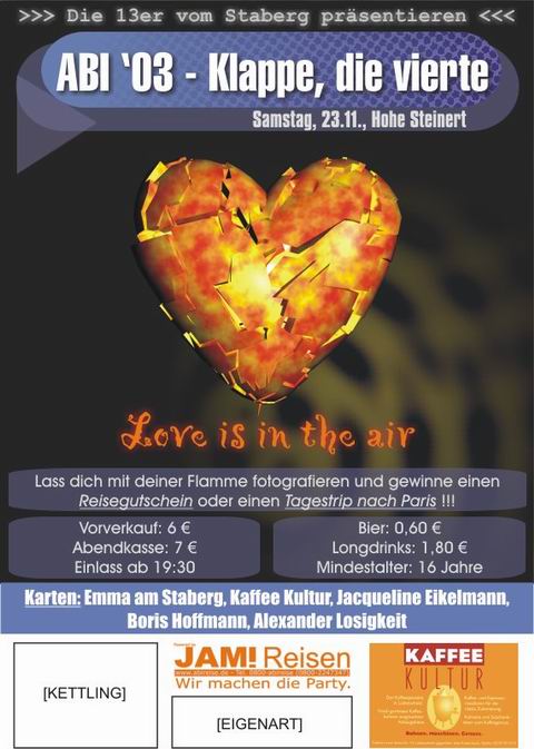 | Party-Plakat "Love is in the air" | 3D-Objekt aus dem Plakat | Party-Plakat "Wir sprengen das Eis" |