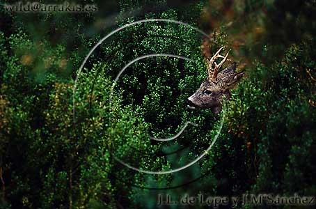 Roe Deer (Capreolus capreolus). Male hidden among Box (Buxus sempervirens). / 1.6 - 1656