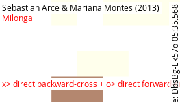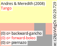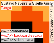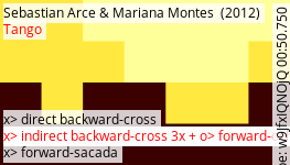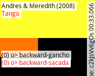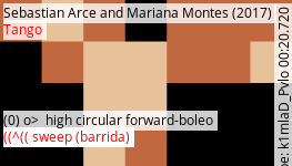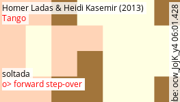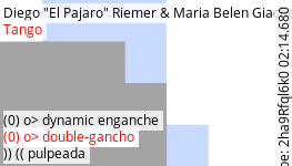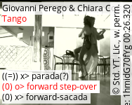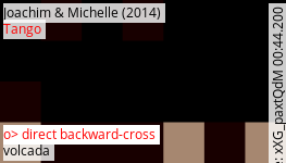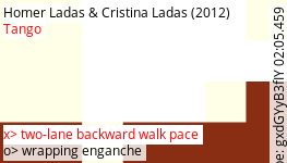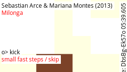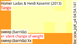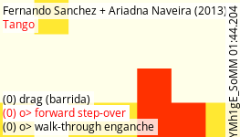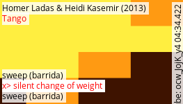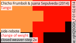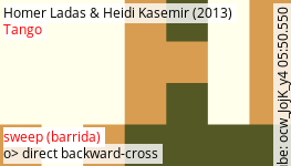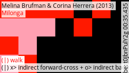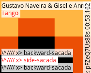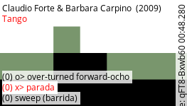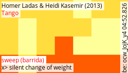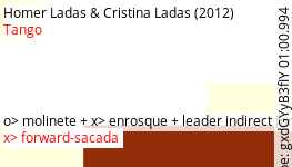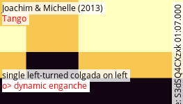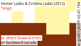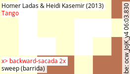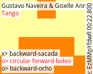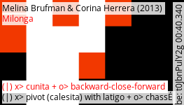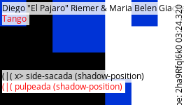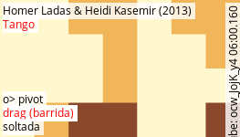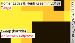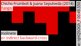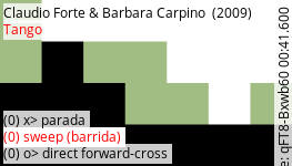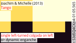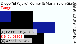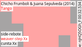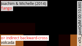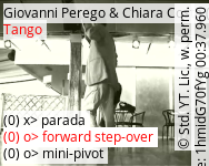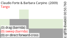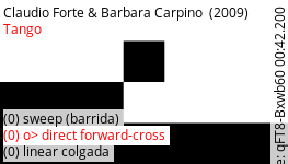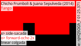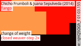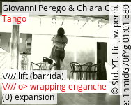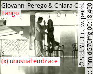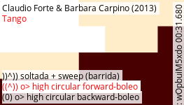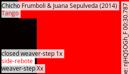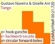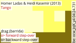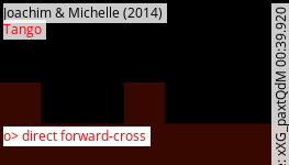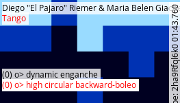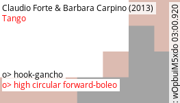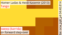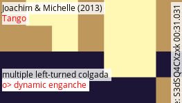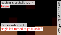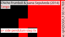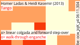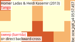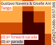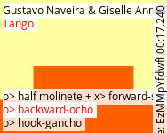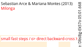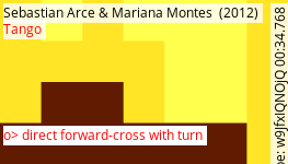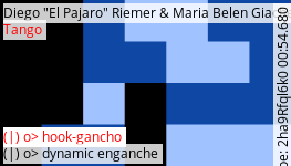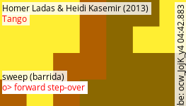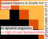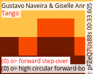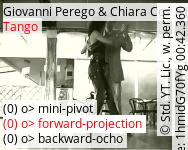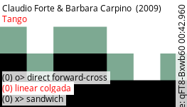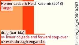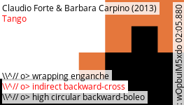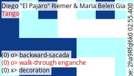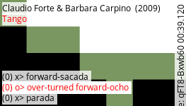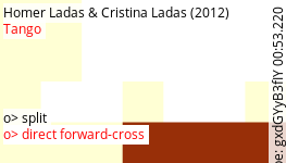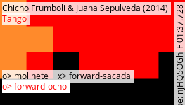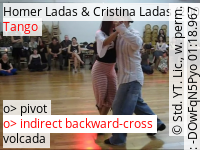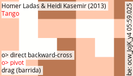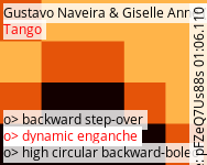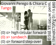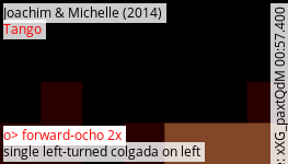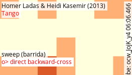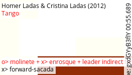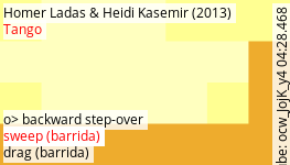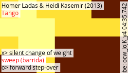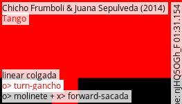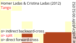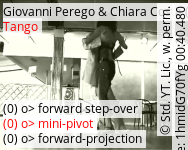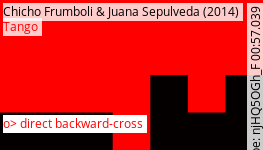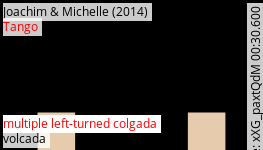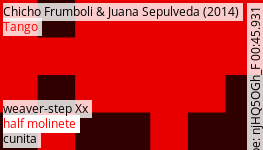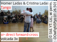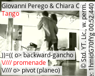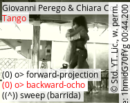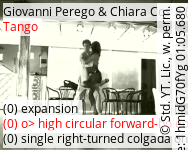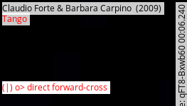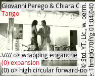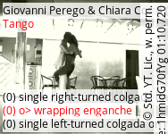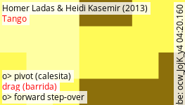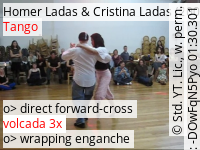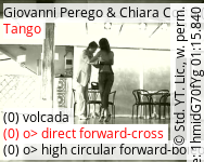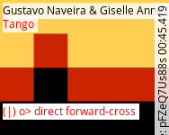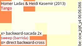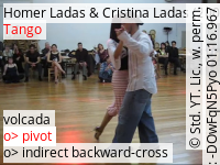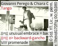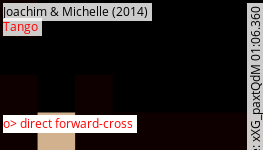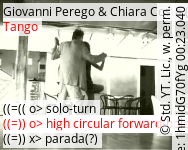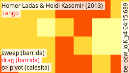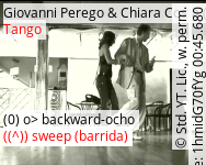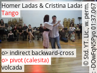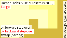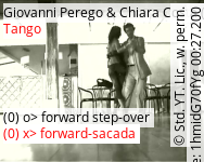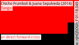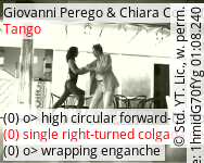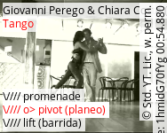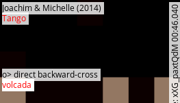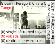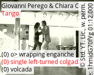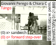 The small images serve as a visual cue and are linked to the youtube videos at the right position, starting about 1 sec before the move in question. At the top you find the name of the dancers and the year when the video was uploaded. Below in red you see the type of music (Tango, Milonga, or Vals) or the language of instruction (English, German, or silence). On the right is given the youtube video ID and the exact time of the move (in the format min:sec.millisec), which can help you jump back to the start of the move, if you want to see it multiple times. At the bottom you see in red the name of the move, and possibly in black above and below the red line the move before and after the main move, respectively. Leaders and followers are indicated by 'x>' and 'o>'. Sometimes you see an additional '3x' or 'Xx', which means three-times or multiple-times. A red frame indicates tutorial videos. The faint images point to example that I find hard to see or redundant, or that follow related example so soon that one usually watches them in one go in any case. I thus recommend to skip them in a first round.