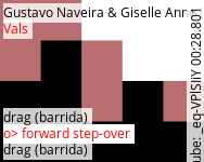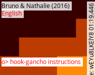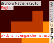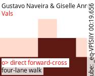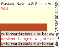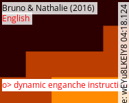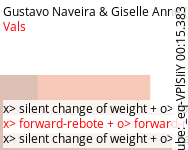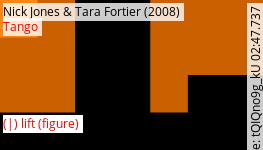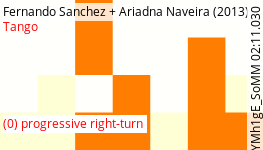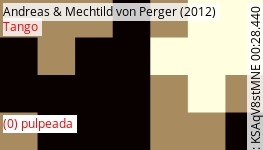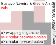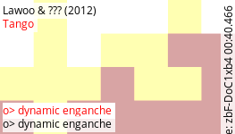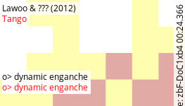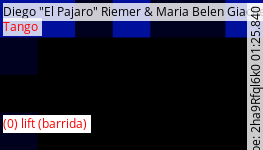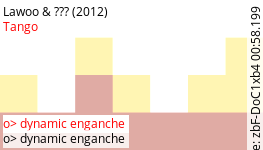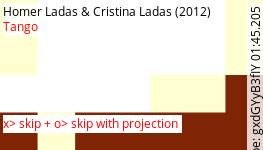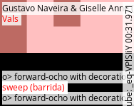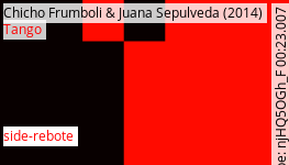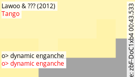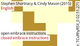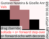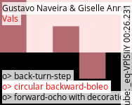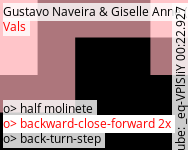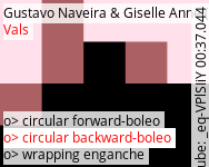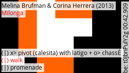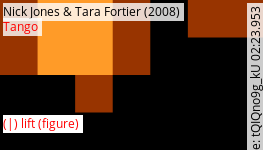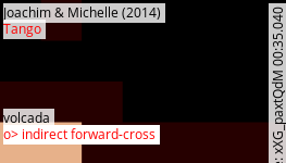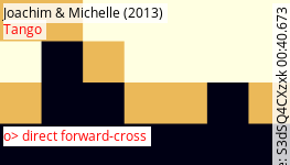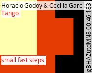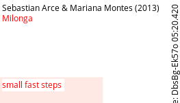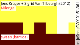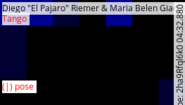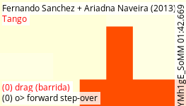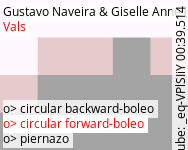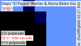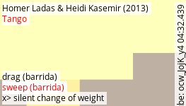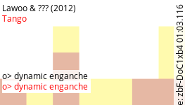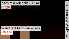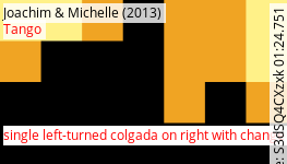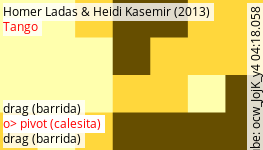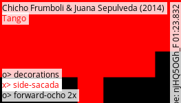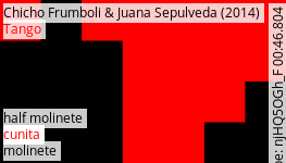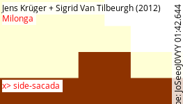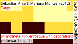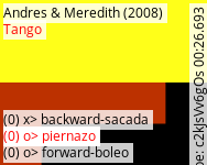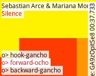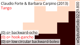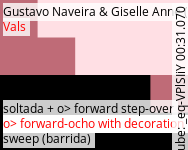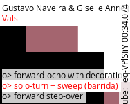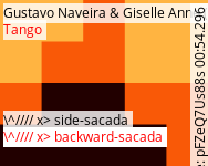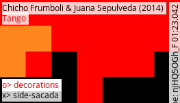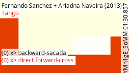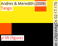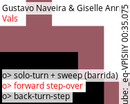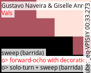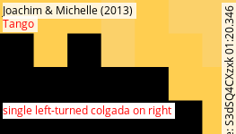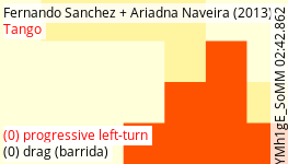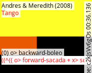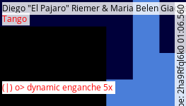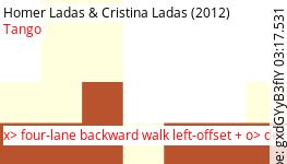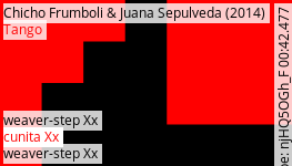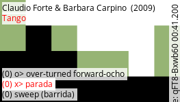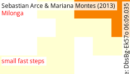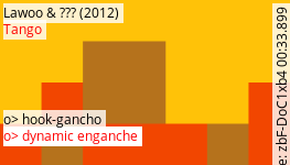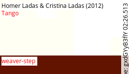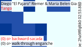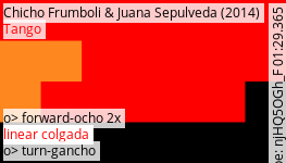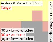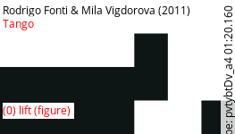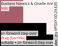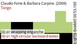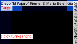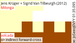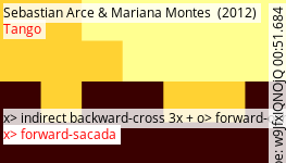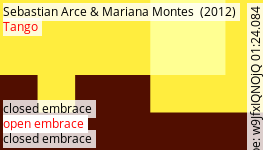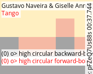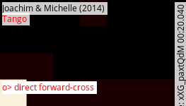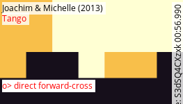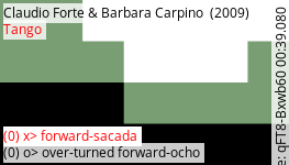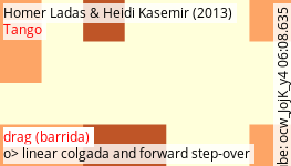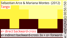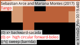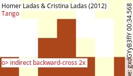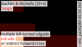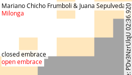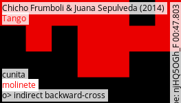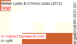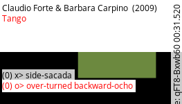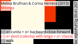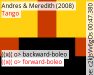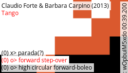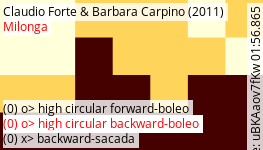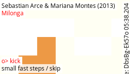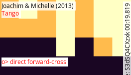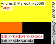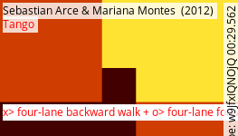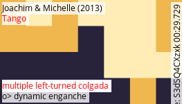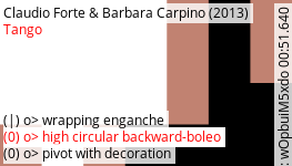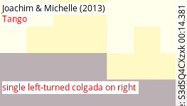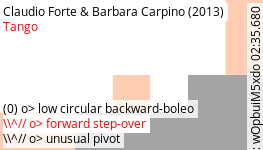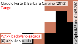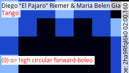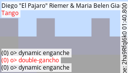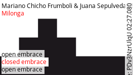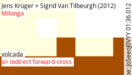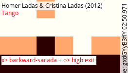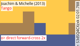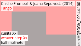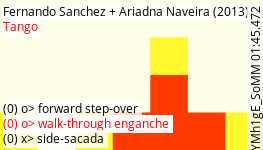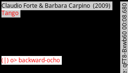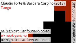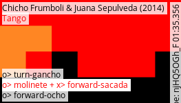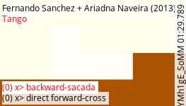 The small images serve as a visual cue and are linked to the youtube videos at the right position, starting about 1 sec before the move in question. At the top you find the name of the dancers and the year when the video was uploaded. Below in red you see the type of music (Tango, Milonga, or Vals) or the language of instruction (English, German, or silence). On the right is given the youtube video ID and the exact time of the move (in the format min:sec.millisec), which can help you jump back to the start of the move, if you want to see it multiple times. At the bottom you see in red the name of the move, and possibly in black above and below the red line the move before and after the main move, respectively. Leaders and followers are indicated by 'x>' and 'o>'. Sometimes you see an additional '3x' or 'Xx', which means three-times or multiple-times. A red frame indicates tutorial videos. The faint images point to example that I find hard to see or redundant, or that follow related example so soon that one usually watches them in one go in any case. I thus recommend to skip them in a first round.