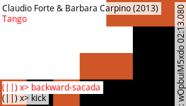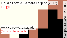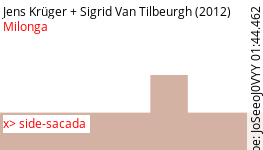 Sacada (entrada) | Shallow sacada (sacada, insert) | Leader's leg replaces partner's unweighted leg position. Entrada doesn't influence movement of the follower's leg. This movement is called entrada or sacada in Spanish depending on instructor. | (https://en.wikipedia.org/wiki/Figures_of_Argentine_tango ) Bild: (Piotr Cirrus, 2011, Wikimedia) © CC BY-SA 3.0 |