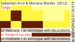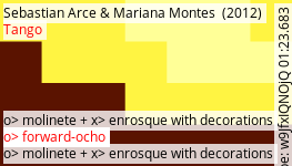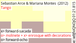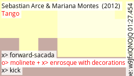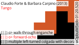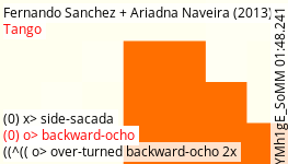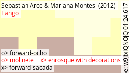 Ocho | Ocho | See back ocho and forward ocho. | A figure "eight" traced on the floor by the follower's feet. | (https://en.wikipedia.org/wiki/Figures_of_Argentine_tango ) | |