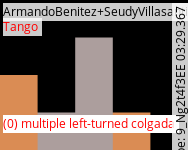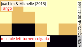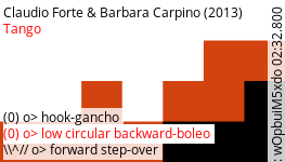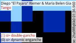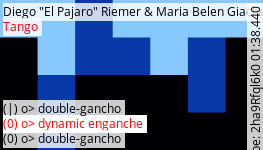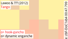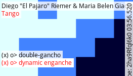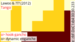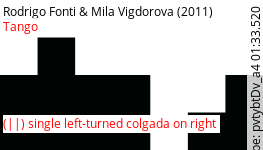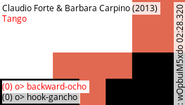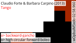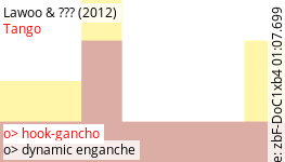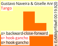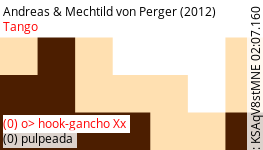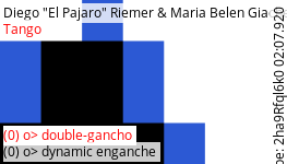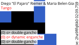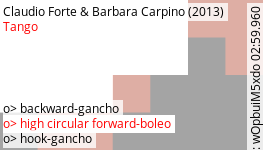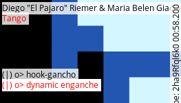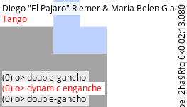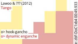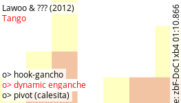 Gancho | Overturned gancho (gancho nuevo) | The follower places her leg between the leader's legs. This move can be lead from overturned back ocho. See also enganche. | (https://en.wikipedia.org/wiki/Figures_of_Argentine_tango ) Bild: (Piotr Cirrus, 2011, Wikimedia) © CC BY-SA 3.0 |