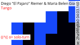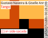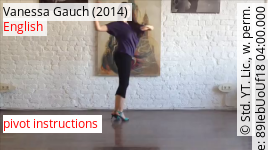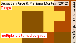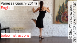 Giro | Turn | Giro is a turning step of the follower around the leader's axis (called the molinete). A common name for this figure is the "grapevine", alternating front and back steps connected by a side step. It is composed of several steps which complete a circle. One of the most common variants is composed of 4 steps (forward step, open step, back step, open step). Sequence of giro steps can follow square or be executed in circular motion (vals). Variants may include just 3 steps around the leader. | (https://en.wikipedia.org/wiki/Figures_of_Argentine_tango ) Bild: (Piotr Cirrus, 2011, Wikimedia) © CC BY-SA 3.0 |