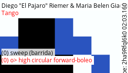 Media Luna | Half moon | A sweeping circular motion of the leg similar to a ronde in ballroom but always danced in contact with the floor, never lofted. Usually danced by the lady and often led with a sacada to the lady’s leg. May be used to bring the lady to an inside gancho. | (http://www.tejastango.com/terminology.html ) | ||