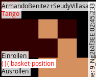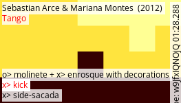 Enrosque | Twist | Leader or follower is pivoting and twists his or her legs in corkscrew action. Often initiated with needle (aguja) position of a foot. | (https://en.wikipedia.org/wiki/Figures_of_Argentine_tango ) Bild: (Piotr Cirrus, 2011, Wikimedia) © CC BY-SA 3.0 |