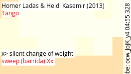 Empujadita | Small push | Displacement of the follower's leg by the leader's leg. | (https://en.wikipedia.org/wiki/Figures_of_Argentine_tango ) Bild 1: (Piotr Cirrus, 2011, Wikimedia) © CC BY-SA 3.0 Bild 2: (Piotr Cirrus, 2011, Wikimedia) © CC BY-SA 3.0 |