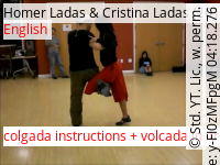 Volcada | from Volcar - to tip-over or capsize; a falling step: The leader causes the follower to tilt or lean forward and fall off her axis before he catches her again. The process produces a beautiful leg drop from her. The movement requires the support of a close embrace. | (http://www.tejastango.com/terminology.html ) | |||