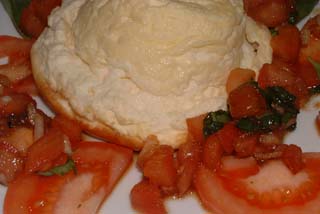 Die Tomaten einritzen, kurz in kochendes Wasser legen, herausnehmen, kalt abschrecken, häuten und die Stielansätze keilförmig herausschneiden. Die Hälfte der Tomaten in Scheiben schneiden, den Rest vierteln und entkernen, das Fruchtfleisch würfeln.